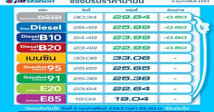 ปตท. – บางจากฯ ปรับราคาขายปลีกน้ำมันทุกชนิดลดลง 0.30 บาทต่อลิตร เว้น E85 ลดลง 0.15 บาทต่อลิตร ลดลง 0.30 บาทต่อลิตร มีผล 7 ก.พ.