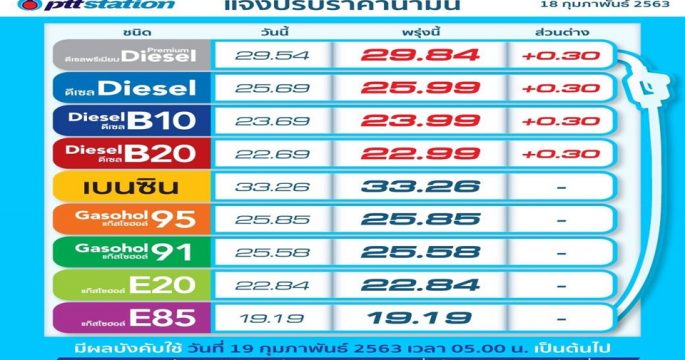 ปตท.-บางจากฯ ปรับราคาดีเซลเพิ่มขึ้น 30 สต./ลิตร ส่วนเบนซิน-แก๊สโซฮอล์คงเดิม มีผล 19 ก.พ.