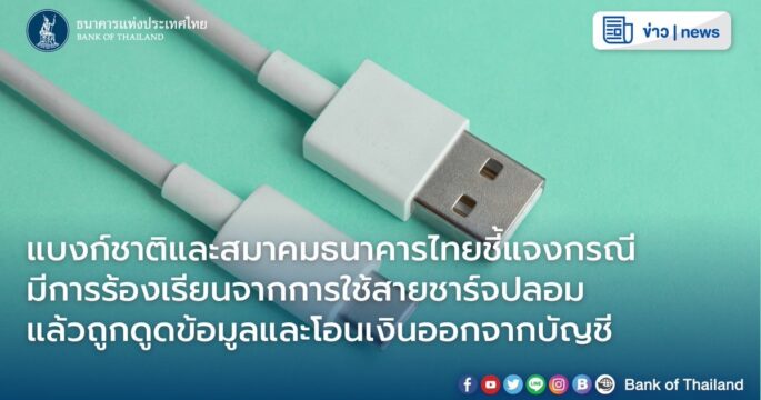 ธปท.-สมาคมธนาคารไทย ร่วมตรวจสอบกรณี “ใช้สายชาร์จปลอมถูกดูดเงิน” ยืนยันไม่ใช่สายชาร์จปลอม แต่มิจฉาชีพหลอกให้โหลดแอปปลอมแฝงมัลแวร์ ก่อนสวมรอยถอนเงินจากบัญชีเหยื่อ เตือนหมั่นอัพเดตมือถือ พร้อมประสานหน่วยงาน-สถาบันการเงินร่วมป้องกัน
