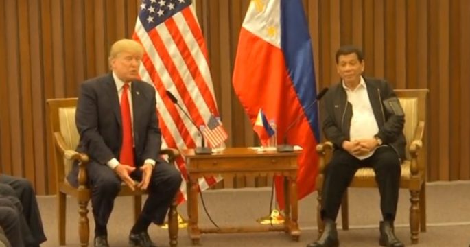 ประธานาธิบดีโดนัลด์ ทรัมป์ ของสหรัฐประกาศว่ามีความสัมพันธ์ที่ดีเยี่ยมกับประธานาธิบดีโรดริโก ดูเตอร์เตของฟิลิปปินส์ และหยอกล้อคุยเล่นระหว่างพบกันที่ฟิลิปปินส์