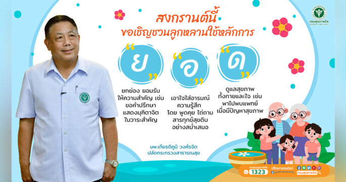 กรมสุขภาพจิตแนะนำครอบครัวไทยต้องใช้ ย อ ด (ยอ.. ออ.. ดอ..) ประกอบด้วย “ย” คือ ให้การยกย่อง “อ” คือ เอาใจใส่ ทั้งอารมณ์และความรู้สึก และ “ด” คือ ดูแลสุขภาพทั้งสุขภาพกายและสุขภาพใจผู้สูงอายุในช่วงเทศกาลสงกรานต์