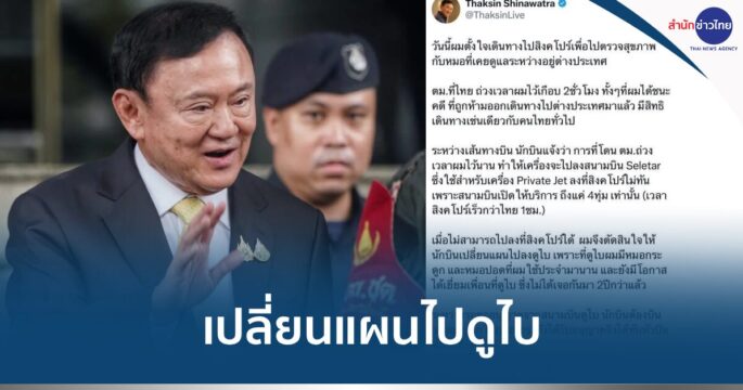 5 ก.ย.-“ทักษิณ” โพสต์แจง เปลี่ยนแผนไปหาหมอที่ดูไบ หลังถูก ตม. ถ่วงเวลา เครื่อง Private Jet ลงที่สิงคโปร์ไม่ทัน ยืนยันกลับไทยมาฟังคำสั่งศาล 9 ก.ย.นี้ ช่วงเย็นวานนี้ (4 ก.ย.) มีกระเเสข่าวว่า นายทักษิณ ชินวัตร ได้ขอเดินทางด้วยเครื่องบินส่วนตัว ที่จอดไว้กับลานบินเอกชนย่านดอนเมือง เเละทราบว่าขอเดินทางไปยัง อ.หัวหิน จ.ประจวบคีรีขันธ์ และมีรายงานว่าจะเดินทางไปต่างประเทศต่อทันที ก่อนในท้ายที่สุด บินไปลงนครดูไบ เหตุอ้างว่าถูกตม.กักตัวต้องเปลี่ยนแผน โดยตอนแรก รายงานข่าวระบุว่า นายทักษิณ มีความต้องการจะบินไปสิงคโปร์ โดยเครื่องบินส่วนตัว มีการแจ้งการเดินทาง มีกำหนดเดินทางในเวลา 18.00 น.พร้อมระบุคนเดินทาง 3 คน อย่างไรก็ตาม เมื่อเวลา 16.00 น. ขณะเครื่องบินเติมน้ำมันอยู่นั้น นายทักษิณ ได้เดินทางมาถึง และขอเพิ่มรายชื่อคนเดินทาง ทำให้เจ้าหน้าที่ไม่อนุญาต เพราะนายทักษิณถูกห้ามเดินทางออกนอกประเทศ ในคดี ม.112 แต่เมื่อตรวจสอบแล้วคดี ม.112 ศาลยกฟ้องไปแล้ว […]