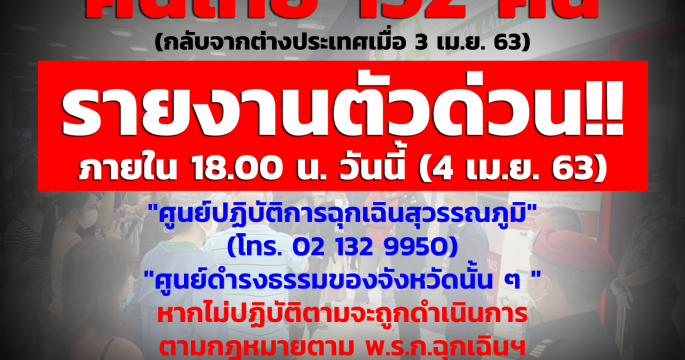 ศบค. แถลงการณ์ 4 เม.ย. 63 แจ้งคนไทยที่กลับจากต่างประเทศ เมื่อ 3 เม.ย. รายงานตัวภายใน 18.00 น. วันนี้ (4 เม.ย.)