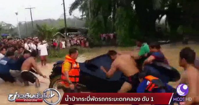 ชาวบ้านจังหวัดกระบี่กว่า 100 คน พร้อมเจ้าหน้าที่กู้ภัยใช้เวลากว่า 1 ชั่วโมง ช่วยกันชักลากรถกระบะ ที่ถูกกระแสน้ำ พัดตกลงไปในคลองทรายขาว ตำบลพรุเตียว อำเภอเขาพนม ขึ้นจากน้ำอย่างทุลักทุเล