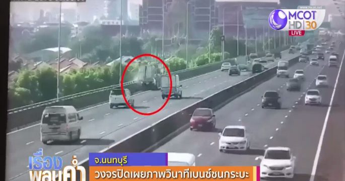 เผยภาพวงจรปิดบนทางด่วนศรีรัช ฝั่งขาเข้าบริเวณเหนือวัดบัวขวัญ วินาทีเบนซ์พุ่งชนท้ายรถกระบะกระแทกคนงานตกทางด่วนดับ 2