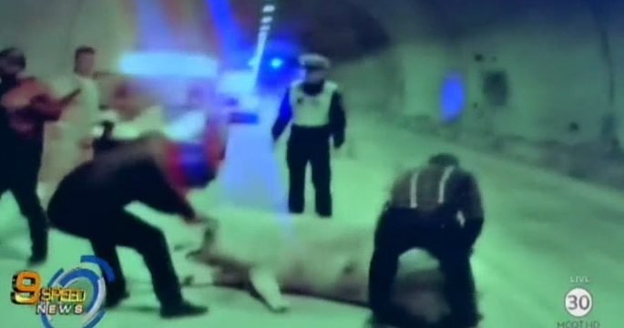 ตำรวจเมืองหลงหยาง มณฑลฝูเจี้ยนของจีน ต้องปิดการจราจรในอุโมงค์ และช่วยกันยกหมูน้ำหนักราว 200 กิโลกรัม ขึ้นรถได้สำเร็จ