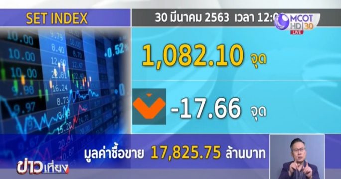 หุ้นไทยช่วงเช้าร่วงลงกว่า 20 จุด โดยดัชนีช่วงเที่ยงปิด -17.66 จุด ที่ระดับ 1,082.10 จุด มูลค่าการซื้อขาย 17,825.75 ล้านบาท ตามทิศทางตลาดต่างประเทศ มีแรงขายนำออกมาในหุ้นกลุ่มพลังงาน
