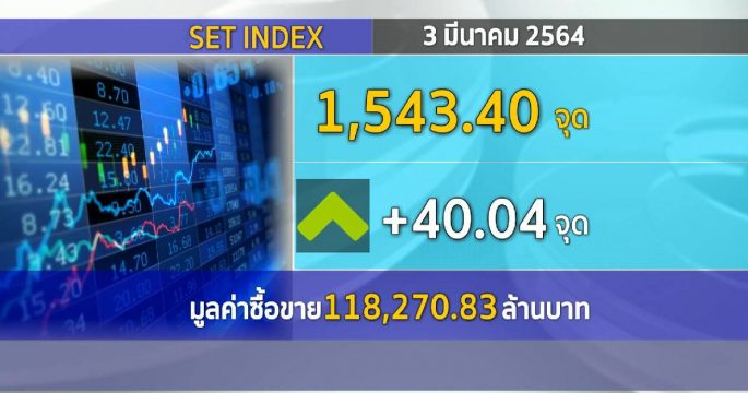 ตลาดหลักทรัพย์ปิดวันนี้ที่ระดับ ปิดวันนี้ที่ระดับ 1,543.40 จุด เพิ่มขึ้น 40.04 จุด (+2.66%) มูลค่าการซื้อขาย 118,270.83 ล้านบาท สอดคล้องตลาดต่างประเทศ คาดหวังการฟื้นตัวเศรษฐกิจ