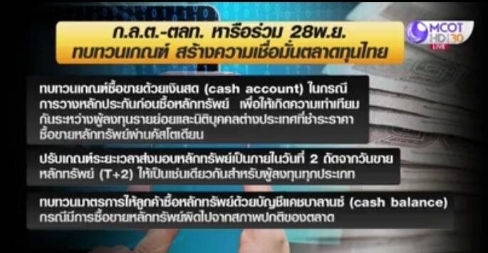 กรุงเทพฯ 29 พ.ย.-ก.ล.ต. และตลาดหลักทรัพย์แห่งประเทศไทย ได้หารือร่วมกันถึงแนวทางที่ตลาดหลักทรัพย์ฯ จะทบทวนเกณฑ์การวางหลักประกันในบัญชีเงินสด เกณฑ์ระยะเวลาการส่งมอบหลักทรัพย์ และเกณฑ์การชำระค่าซื้อหุ้นล่วงหน้ากรณีหุ้นเข้าลักษณะร้อนแรง เพื่อให้เกิดความเท่าเทียมกันระหว่างผู้ลงทุนแต่ละประเภท ณ สำนักงาน ก.ล.ต. เมื่อวันที่ 28 พฤศจิกายน 2566
