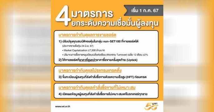 ตลาดหลักทรัพย์ฯ เดินหน้ายกระดับคุมขายชอร์ต และโปรแกรมเทรดดิ้งเกณฑ์ใหม่ เริ่ม 1ก.ค. กำหนดคุณสมบัติของหุ้นที่ขายชอร์ต, ราคาขายชอร์ต, การขึ้นทะเบียนผู้ลงทุนที่ส่งคำสั่งซื้อขายด้วย HFT และการเปิดเผยข้อมูลผู้ลงทุนที่มีพฤติกรรมการส่งคำสั่งซื้อขายที่ไม่เหมาะสม