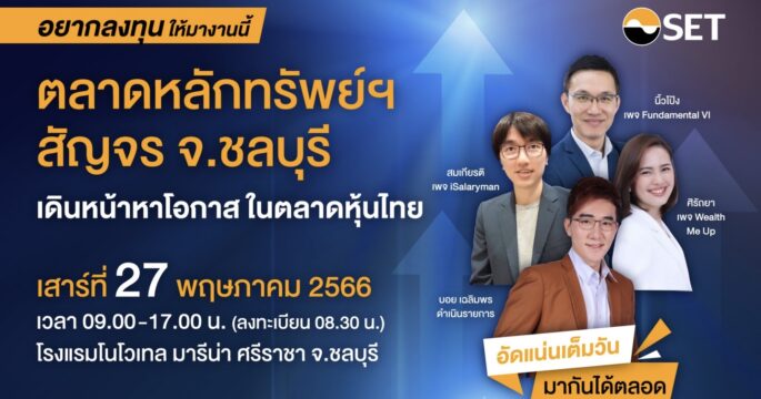 กรุงเทพฯ 23 พ.ค.-ตลาดหลักทรัพย์ฯ ชวนชาวชลบุรีและใกล้เคียง เดินหน้าหาโอกาสในตลาดหุ้นไทย ในงาน“ตลาดหลักทรัพย์ฯ สัญจร จ. ชลบุรี” 27 พ.ค.
