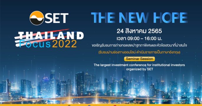 กรุงเทพฯ 18 ส.ค.-ตลาดหลักทรัพย์ฯ จัดงาน “Thailand Focus 2022 : THE NEW HOPE” ชูศักยภาพบริษัทจดทะเบียน (บจ.) และเศรษฐกิจไทยที่ปรับตัวและฟื้นตัวอย่างแข็งแกร่งภายใต้บริบทที่เปลี่ยนไป โดยได้รับเกียรติจากรัฐมนตรีว่าการกระทรวงการคลังนายอาคม เติมพิทยาไพสิฐ ปาฐกถาพิเศษสร้างความเชื่อมั่นแก่ผู้ลงทุนสถาบันต่างชาติ นำเสนอยุทธศาสตร์กระตุ้นเศรษฐกิจหลังเปิดประเทศ พร้อมด้วยภาคธุรกิจ ตลาดเงิน ตลาดทุน ร่วมเวทีเสวนา โดยปีนี้มีผู้บริหารระดับสูงของ บจ. กว่า 120 บริษัท นำเสนอข้อมูลการดำเนินธุรกิจแก่ผู้ลงทุนสถาบัน ระหว่าง 24-26 สิงหาคม 2565 ที่โรงแรมแกรนด์ ไฮแอทเอราวัณ กรุงเทพฯ