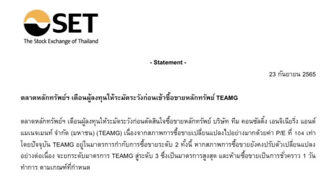 กรุงเทพฯ 23 ก.ย.-ตลาดหลักทรัพย์ฯ เตือนผู้ลงทุนให้ระมัดระวังก่อนเข้าซื้อขายหลักทรัพย์ TEAMG หลังราคาพุ่ง pe แตะ 104 เท่า ชี้ ราคาผันผวนสูง จ่อยกระดับ ติด T3
