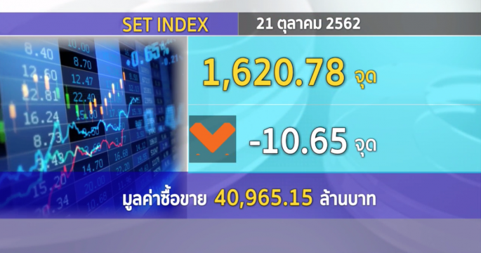 ตลาดหลักทรัพย์ฯ ปิดวันนี้ (21 ต.ค.) ที่ระดับ 1,620.78 จุด ลดลง 10.65 จุด หรือ0.65% มูลค่าการซื้อขาย 40,965.15 ล้านบาท โดยดัชนีเคลื่อนไหวแดนลบเป็นส่วนใหญ่ ทำระดับสูงสุด 1,631.63 จุด และต่ำสุด 1,619.49 จุด