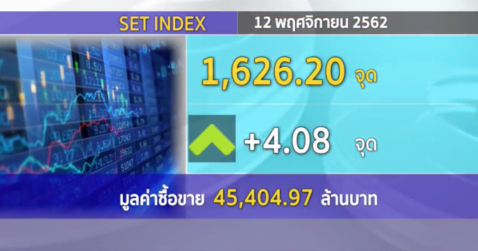 ดัชนีตลาดหลักทรัพย์ฯ ปิดวันนี้ (12 พ.ย.) ที่ระดับ 1,626.20 จุด เพิ่มขึ้น 4.08 จุด หรือ0.25% มูลค่าการซื้อขาย 45,404.97 ล้านบาท โดยดัชนีเคลื่อนไหวแดนบวกตลอดทั้งวัน ทำระดับสูงสุด 1,632.82 จุด และต่ำสุด 1,622.18 จุด.