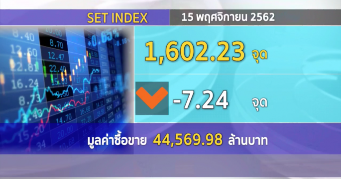 ตลาดหลักทรัพย์ปิดวันนี้ที่ระดับ 1,602.23 จุด ลดลง 7.24 จุด (-0.45%) มูลค่าการซื้อขาย 44,569.98 ล้านบาท