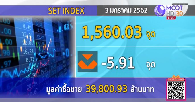 ดัชนีตลาดหลักทรัพย์ไทยขยับลดลง 5.91 จุด ดัชนีปิดที่ 1,560.03 จุด มูลค่าการซื้อขาย 39,800.93 ล้านบาท