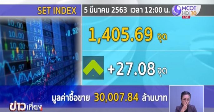 ดัชนีหุ้นไทยเช้านี้ดีดตัวขึ้นมาแรงตามตลาดหุ้นต่างประเทศ หลังจากนักลงทุนตั้งความหวังกับการผ่อนคลายนโยบายการเงินของธนาคารกลางทั่วโลก ดัชนีช่วงเที่ยงปิด +27.08 จุด ที่ระดับ 1,405.69 จุด มูลค่าการซื้อขาย 30,007.84 ล้านบาท