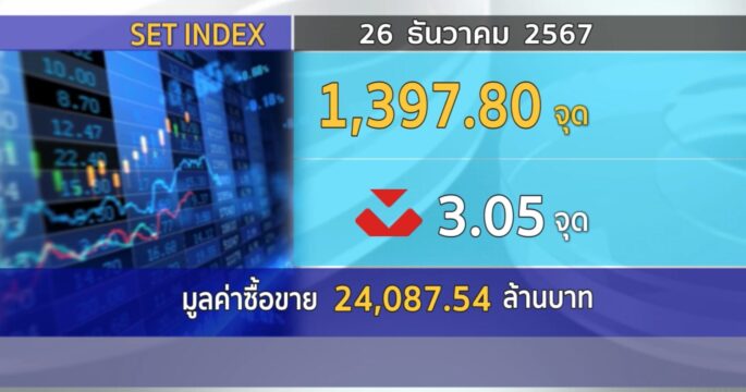 ตลาดหุ้นไทยปิดวันนี้ที่ 1,397.80 จุด ลดลง 3.05 จุด (-0.22%) มูลค่าการซื้อขาย 24,087.54 ล้านบาท