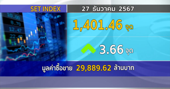 SET ปิดวันนี้ที่ 1,401.46 จุด เพิ่มขึ้น 3.66 จุด (+0.26%) มูลค่าการซื้อขาย 29,955.99 ล้านบาท
