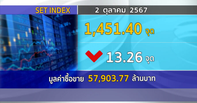 SET ปิดวันนี้ที่ 1,451.40 จุด ลดลง 13.26 จุด (-0.91%) มูลค่าซื้อขาย 57,903.77 ล้านบาท