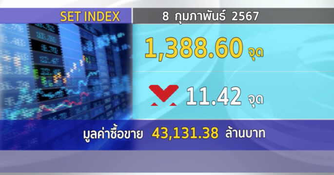 SET ปิดวันนี้ที่ 1,388.60 จุด ลดลง 11.42 จุด (0.82%) มูลค่าซื้อขาย 43,082.48 ล้านบาท