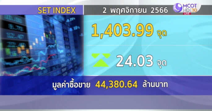 SET ปิดวันนี้ที่ 1,403.99 จุด เพิ่มขึ้น 24.03 จุด (+1.74%) มูลค่าซื้อขาย 44,380.64 ล้านบาท