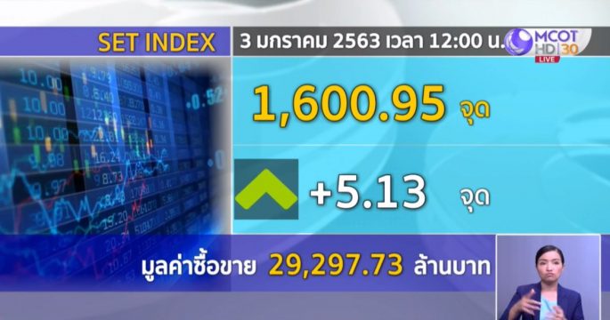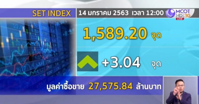 หุ้นไทยภาคเช้า (13 ม.ค.) แกว่งแคบๆ นักลงทุนยังจับตาการลงนามข้อตกลงการค้าสหรัฐ-จีน บวกได้ 3.04 จุด ดัชนีช่วงเที่ยงอยู่ที่ 1,583.67 จุด มูลค่าการซื้อขาย 29,559.52 ล้านบาท