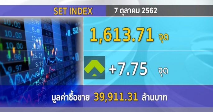ตลาดหลักทรัพย์ปิดวันนี้ที่ระดับ 1,613.71 จุด เพิ่มขึ้น 7.75 จุด มูลค่าการซื้อขาย 39,911.31 ล้านบาท การซื้อขายหุ้นวันนี้ ดัชนีหุ้นไทยเคลื่อนไหวในแดนบวกตลอดทั้งวัน