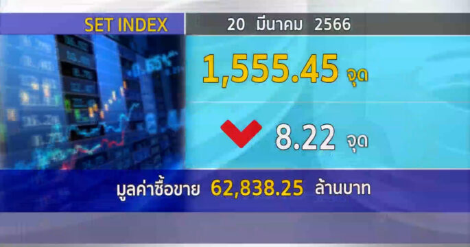 SET ปิดวันนี้ที่ 1,555.45 จุด ลดลง 8.22 จุด (-0.53%) มูลค่าการซื้อขาย 62,843.04 ล้านบาท
