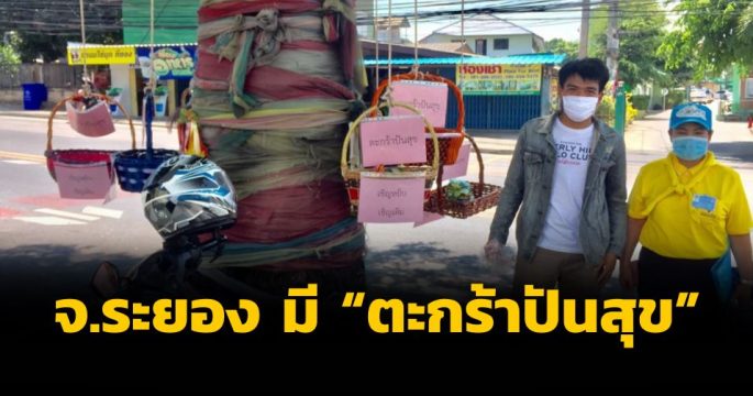 นายอำเภอเมืองระยองผุด “ตะกร้าปันสุข” แขวนต้นมะค่าใหญ่เคียงคู่ด้านหน้าอำเภอมานาน ช่วยผู้เดือดร้อนโควิด-19 หยิบอาหารไปบริโภคได้ แต่ขออย่าเก็บตุน เผื่อไว้ให้คนหลังบ้าง