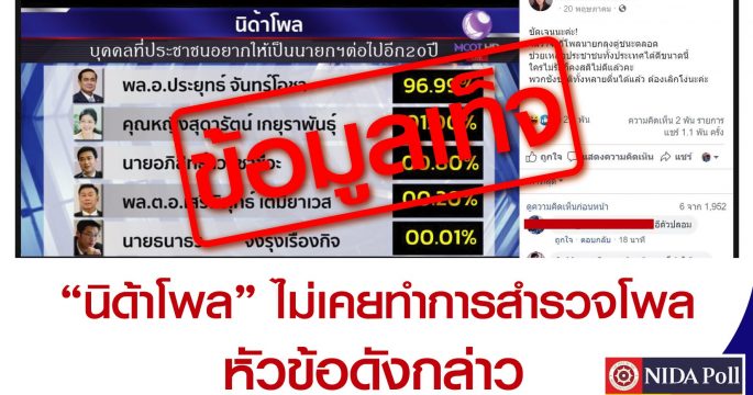 สำนักข่าวไทย อสมท ยืนยัน “ไม่เคยทำ หรือเผยแพร่” ข้อมูลที่ระบุว่ามีผลสำรวจของนิด้าโพล NIDA Poll เรื่อง “บุคคลที่ประชาชนอยากให้เป็นนายกฯ ต่อไปอีก 20 ปี” โดยข้อมูลและภาพดังกล่าวถูกผู้ไม่ประสงค์ดี นำไปตัดต่อ แอบอ้าง ซึ่งสำนักข่าวไทยกำลังพิจารณาว่าจะดำเนินคดีตามกฎหมาย