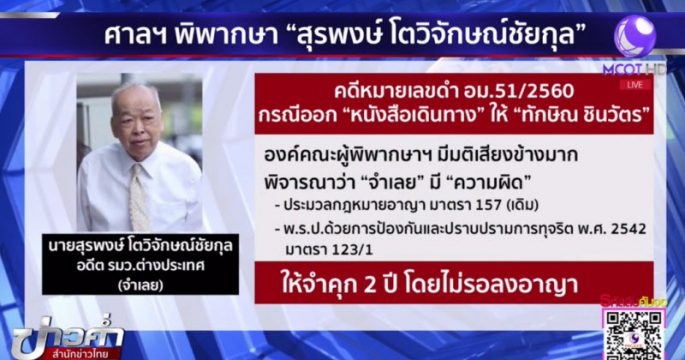 ศาลฎีกาแผนกคดีอาญาของผู้ดำรงตำแหน่งทางการเมือง มีคำพิพากษาจำคุก 2 ปี นายสุรพงษ์ โตวิจักษณ์ชัยกุล อดีต รมว.ต่างประเทศ กรณีออกพาสปอร์ตให้นายทักษิณ ชินวัตร
