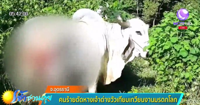 “เจ้าด่าง” วัว 1 ใน 4 ตัว ที่ใช้เทียมเกวียนงานมรดกโลกบ้านเชียง จ.อุดรธานี ซึ่งเคยถูกส่งเข้าโรงฆ่าสัตว์ แต่มีผู้ใจบุญร่วมไถ่ชีวิตออกมาเมื่อ 6 ปีก่อน ถูกมือดีแอบตัดหางขาด แผลยังมีเลือดไหลซึมออกมาตลอดเวลา ชาวบ้านวอนตำรวจติดตามจับคนร้ายให้ได้