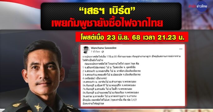 24 มิ.ย. – “เสธฯ เบิร์ด” เผยกัมพูชายังซื้อไฟจากไทย 6 จุด จากที่เคยซื้อ 9 จุด ตัดเพียง 3 จุด ที่คลองลึก-ปอยเปต และหาดเล็ก-เกาะกง เท่านั้น พล.ต.วันชนะ สวัสดี โฆษกกองทัพไทย โพสต์ข้อมูลนี้ ผ่านทางเฟซบุ๊ก ส่วนตัว “Wanchana Sawasdee” ว่า การประกาศตัดไฟเมื่อ 17 มิ.ย.68 ที่ผ่านมาของกัมพูชา เรามาดูว่าปัจจุบันสถานการณ์การจ่ายไฟฟ้าเป็นยังไงบ้าง ก่อนจะประกาศตัดไฟ ไทยจ่ายไฟให้ เขมร 9 จุด คือ ปัจจุบัน เขมรตัดไฟไปแค่ 3จุดเท่านั้น คือ ข้อ 3,4,9 ยังคงจ่ายไฟอยู่ 6 จุด .-สำนักข่าวไทย