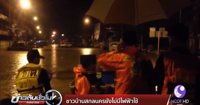 หลายชุมชนในพื้นที่ อ.เมือง จ.สกลนคร ใช้ชีวิตอยู่ท่ามกลางความมืด เพราะการไฟฟ้ายังต้องตัดกระแสไฟ เนื่องจากระดับน้ำท่วมสูง