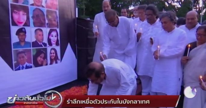 ชาวกรุงธากาของบังกลาเทศร่วมกันจัดพิธีรำลึกถึงเหยื่อที่เสียชีวิตจากเหตุการณ์ 5 มือปืนบุกเข้าสาดกระสุนอย่างไม่เลือกหน้าและจับลูกค้าในร้านกาแฟ โฮลี อาร์ติสัน เบเกอรี่เป็นตัวประกัน