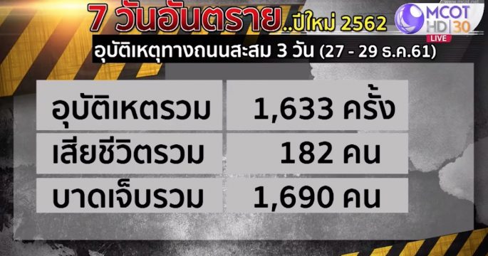 สถิติอุบัติเหตุทางถนนช่วงเทศกาลปีใหม่ ตั้งแต่ 27 – 29 ธันวาคม ทะลุ 1,600 ครั้ง เสียชีวิต 182 คน บาดเจ็บ 1,690 คน แต่มี 16 จังหวัดที่ไม่มีผู้เสียชีวิตเลย ส่วนเชียงใหม่ครองแชมป์อุบัติเหตุสะสมและบาดเจ็บสูงสุด