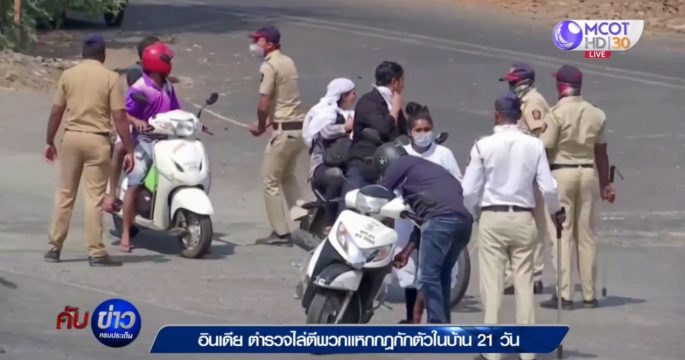 ตำรวจอินเดียใช้ไม้ไล่ตีประชาชนที่ฝ่าฝืนมาตรการห้ามออกจากบ้าน 3 สัปดาห์ เพื่อควบคุมการแพร่ระบาดโควิด-19 ล่าสุดอินเดียพบผู้ติดเชื้อแล้ว 562 คน เสียชีวิต 11 คน