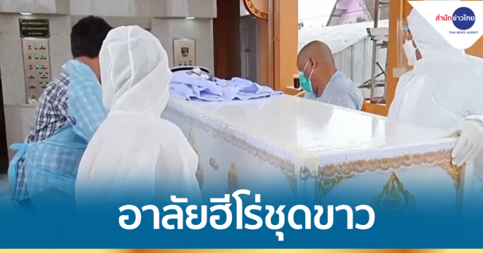 เจ้าหน้าที่กู้ภัยนำร่างพยาบาลสาวที่ติดเชื้อโควิด-19 จากการปฏิบัติหน้าที่ สู่พิธีฌาปนกิจที่วัดบางม่วง จ.นนทบุรี ซึ่งมีญาติและเพื่อนเดินทางมาร่วมพิธีหลายคน