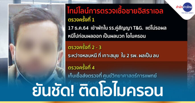 ผลตรวจยืนยันแล้วชายอิสราเอลที่หนีออกจาก T&G ติดเชื้อโอไมครอน แต่สาเหตุที่ไปตรวจเชื้อ 2 ครั้งตอนหนีไปเที่ยวพัทยาและสมุย ผลออกมาเป็นลบ เนื่องจากปริมาณเชื้อน้อย และยังถือว่ามีความผิดกรณีหนีออกจากระบบด้วย