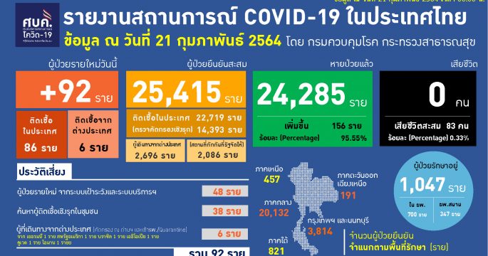 ศบค. รายงานตัวเลขผู้ติดเชื้อโควิด-19 วันนี้พบผู้ติดเชื้อใหม่ 92 คน จำแนกเป็นติดเชื้อในประเทศ 86 คน และ 6 คนมาจากต่างประเทศ ส่วนชลบุรีมีบุคลากรทางการแพทย์ติดเชื้อ 1 คน สมุทรสาครยังพบผู้ป่วยมากสุดในประเทศ