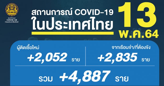 โควิดวันนี้ ยอดติดเชื้อรวม 4,887 ราย จำแนกเป็นติดเชื้อใหม่ 2,052 ราย ติดเชื้อในเรือนจำ/ที่ต้องขัง 2,835 ราย ยืนยันสะสม 64,891 คน มีผู้เสียชีวิตเพิ่ม 32 ราย