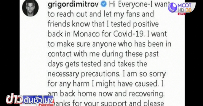 กริกอร์ ดิมิตรอฟ นักเทนนิสชื่อดังชาวบัลแกเรีย เปิดเผยผ่านอินสตาแกรมส่วนตัว ระบุตนเองถูกตรวจพบติดเชื้อโควิด-19