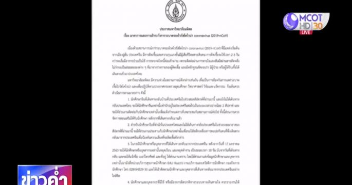 ล่าสุด ทางมหาวิทยาลัยมหิดล ได้มีการออกประกาศวันนี้ ใจความว่า 1. ให้นักศึกษาจีนที่เดินทางกลับบ้านที่ประเทศจีนในช่วงสองสัปดาห์ที่ผ่านมานี้ และยังไม่ได้เดินทาง กลับประเทศไทย ขอให้นักศึกษาจีนเหล่านันพำนักอยู่ในประเทศจีนต่อไปเป็นระยะเวลาอย่างน้อย 2 สัปดาห์