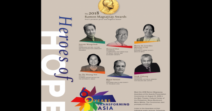 มูลนิธิรางวัลรามอน แมกไซไซของฟิลิปปินส์ประกาศชื่อผู้ได้รับรางวัลประจำปีนี้ ประกอบด้วยชาวกัมพูชา ชาวติมอร์เลสเต ชาวฟิลิปปินส์ ชาวเวียดนาม และชาวอินเดีย 2 คน