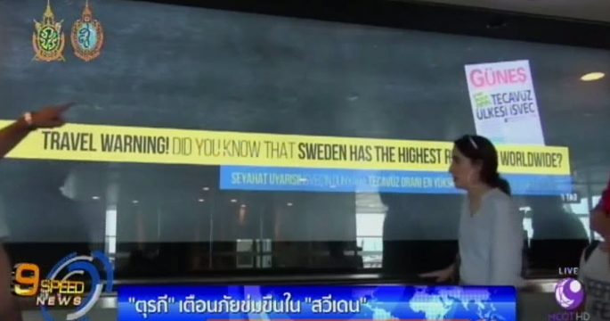 สนามบินอตาเติร์ก ขึ้นป้ายเตือนภัยการข่มขืนในสวีเดนภายในอาคารผู้โดยสาร โดยมีข้อความระบุว่า คุณรู้หรือไม่ว่าสวีเดนเป็นประเทศที่มีอัตราการก่อคดีข่มขืนมากที่สุดในโลก