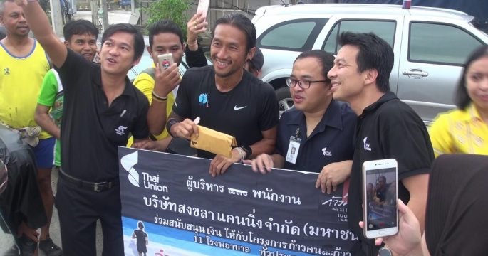 “ตูน บอดี้สแลม” ออกวิ่งโครงการก้าวคนละก้าว เพื่อ 11 โรงพยาบาล เป็นวันที่ 9 ยังอยู่ในพื้นที่ จ.สงขลา ตลอดเส้นทางมีประชาชนมารอให้กำลังใจและมอบเงินบริจาคล้นหลาม ล่าสุดยอดบริจาคอยู่ที่ 136 ล้านบาท