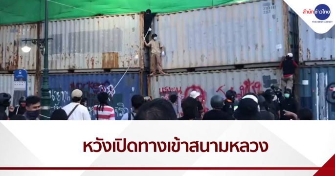 มวลชนพยายาม ดึงคอนเทนเนอร์ล้ม หวังเปิดทางเข้าสนามหลวง ด้านตำรวจประกาศไม่ให้ผู้ชุมนุมข้ามผ่านเข้ามา