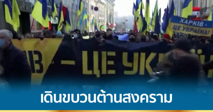 ชาวยูเครนหลายพันคนร่วมเดินขบวนในเมืองคาร์เคียฟ แสดงพลังต่อต้านการรุกรานของรัสเซียที่อาจเกิดขึ้นในเร็วๆ นี้